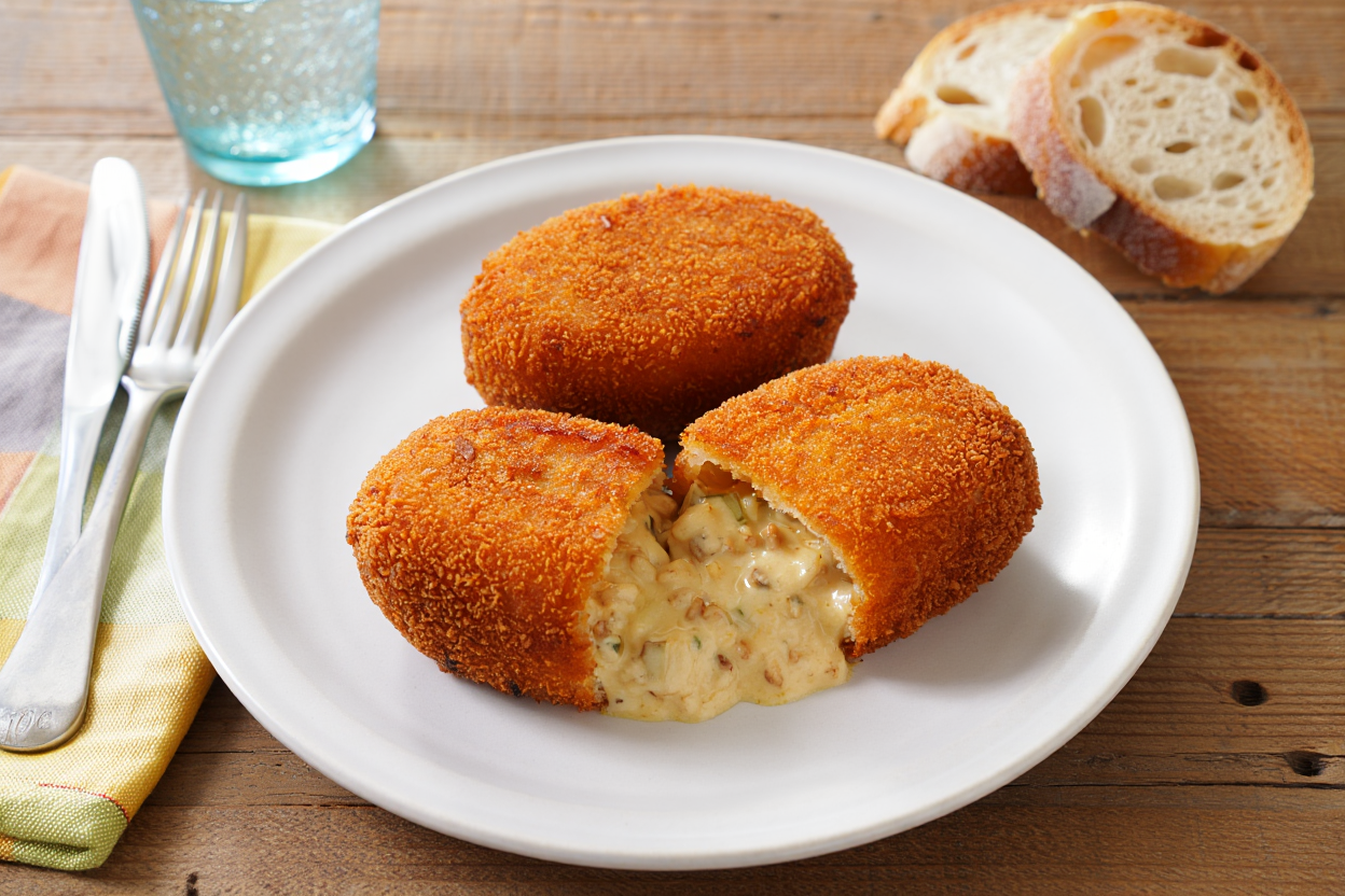 Estos croquetones de pollo son enormes, crujientes por fuera y cremosos por dentro, perfectos para pegarle un buen bocado mientras sobrevives a cualquier jornada de trabajo o turno sin perder la sonrisa 🥓🥔😄