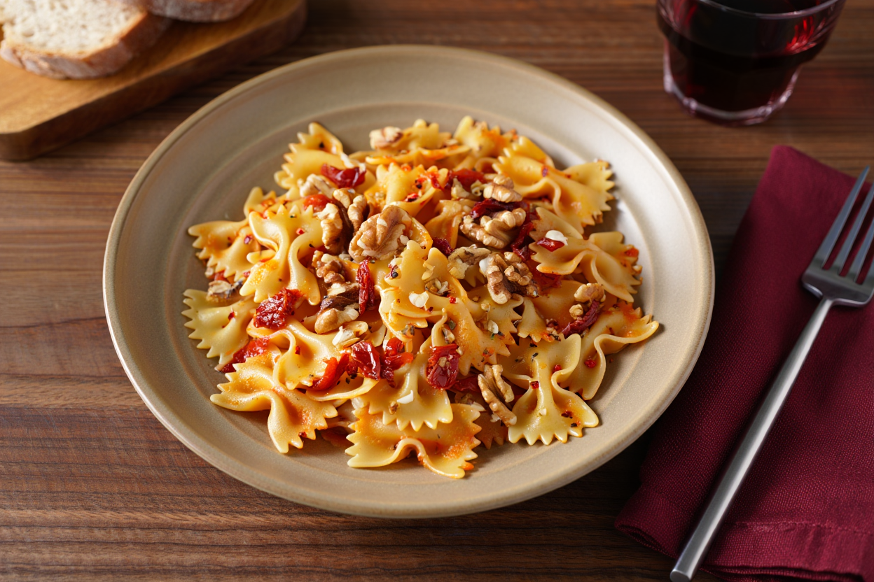 Este plato con pasta farfale, nueces, tomate seco, pimienta negra y aove tiene tanta chispa que no sabes si invitarlo a cenar… o a bailar. 😅🍝💃😉