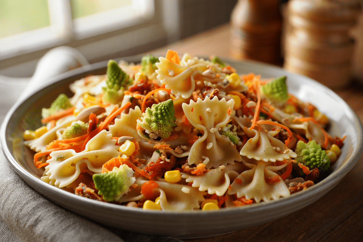 Una ensalada fresca y colorida elaborada con pasta tipo margarita tricolor, aliñada con un sabroso pesto rosso a base de tomate seco, ajo, parmesano, cacahuetes, pipas, AOVE, orégano y albahaca. Acompañada de floretes de romanescu al dente, maíz dulce, zanahoria rallada y queso latino fresco, todo perfectamente mezclado para una textura equilibrada y un sabor intenso. Ideal como plato único o como acompañamiento ligero.