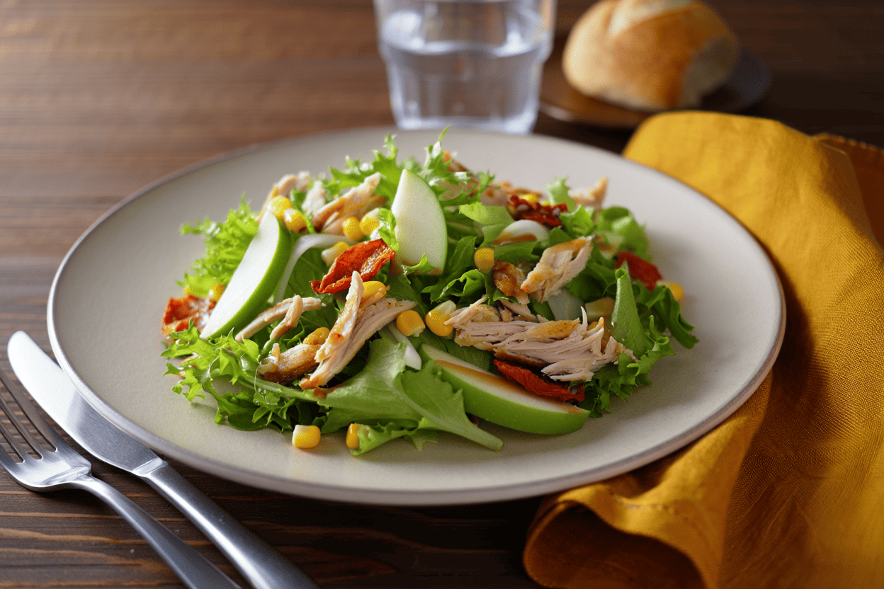 Esta ensalada tiene tanto espíritu de granja que, tras probarla, te entran ganas de comprarte un gallinero, plantar manzanos y hablar con las gallinas, aunque vivas en un loft de cemento sin balcón. 🐓🍎🚜🏢😂