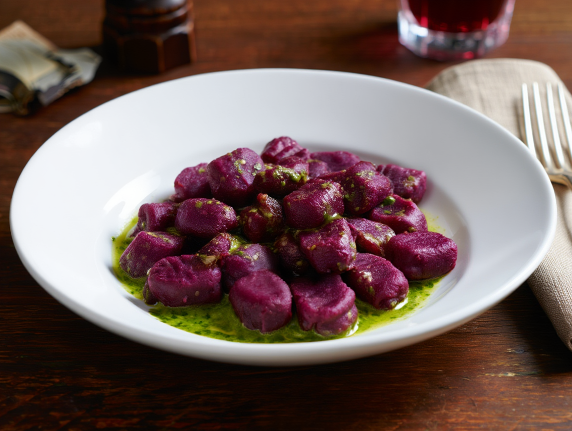 Aceite de oliva virgen extra, Sal, Patata, Harina, Huevo, Pesto calabrese: ajo, guindilla, pimienta negra, pimientos del piquillo, tomate seco, orégano, albahaca, sal, aceite de oliva virgen extra, ricotta y queso curado., Anacardos