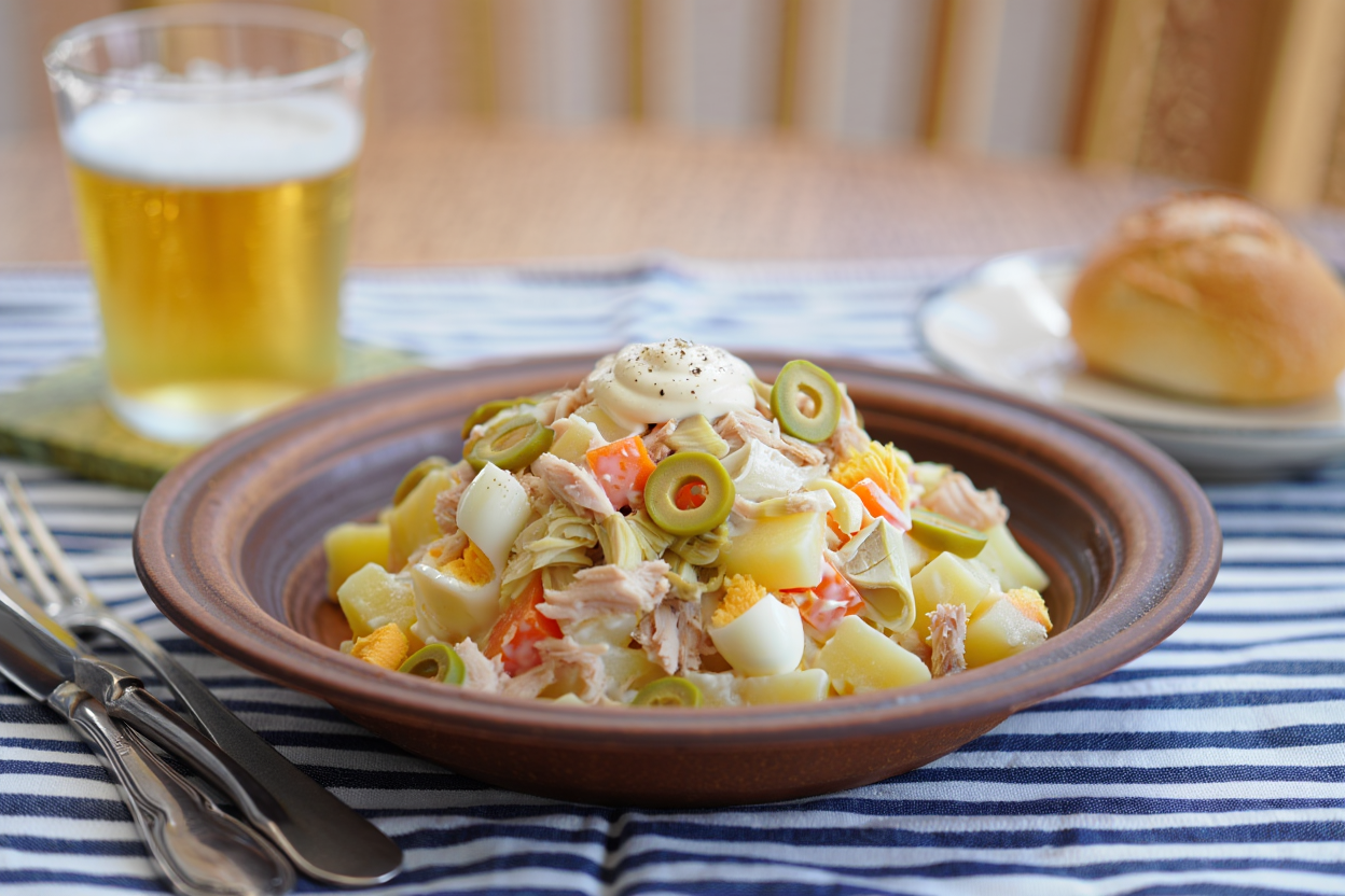 Huevo, Mayonesa, Patata, Zanahoria, Alcachofas, Pimienta negra, Atún en aceite de girasol, Aceitunas verdes