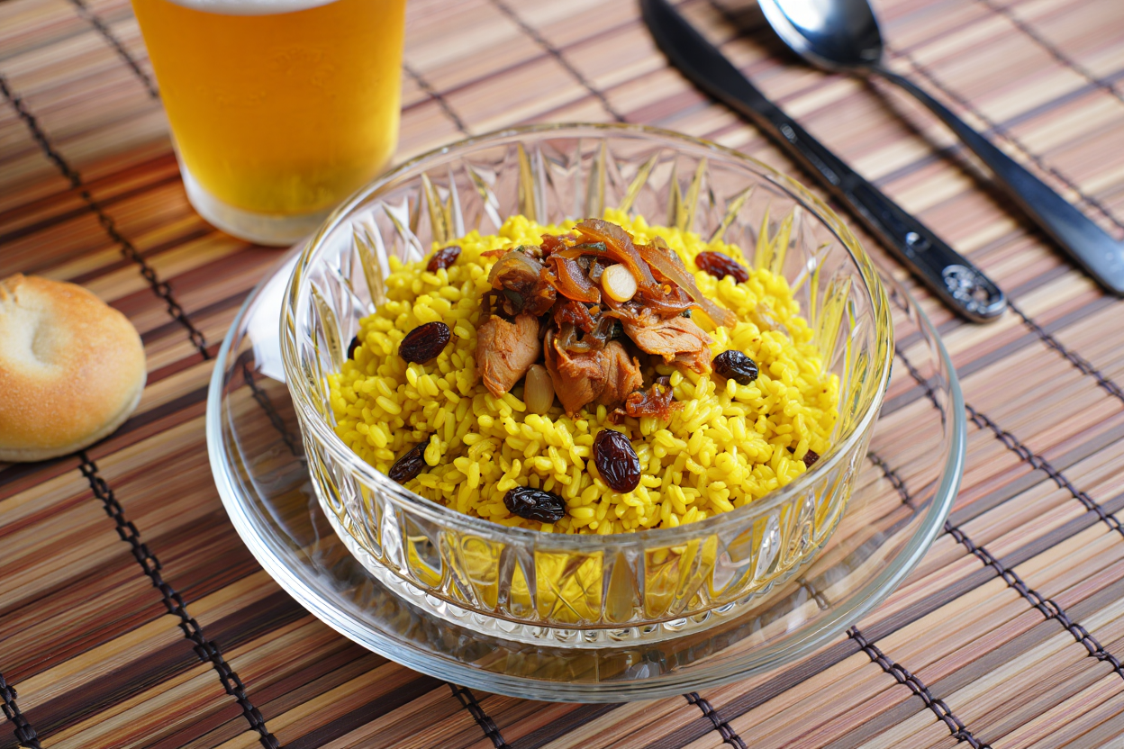 Pilaf de trigo tierno con pollo al curry amarillo