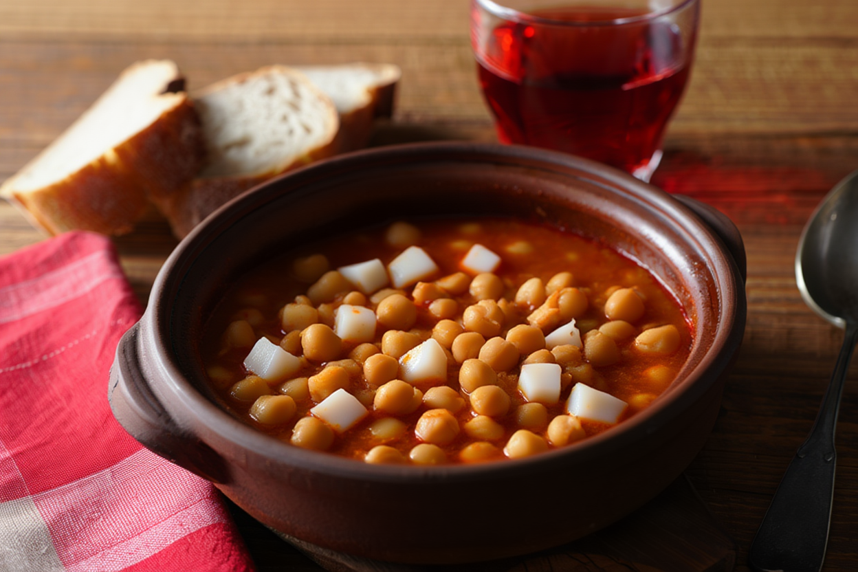 Ajo, Cebolla, Garbanzos, Sal, Sofrito de tomate y pimientos: tomate, cebolla, aceite de oliva virgen extra, pimiento rojo, pimiento verde., Zanahoria, Pota, Aceituna verde laminada