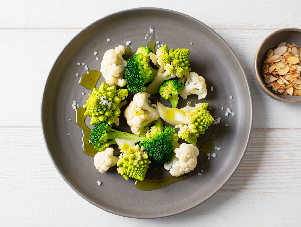 El jardín comestible más bonito del menú. El romanescu es tan perfecto que da pena hincarle el diente. ¡Arte vegetal! 🥦✨