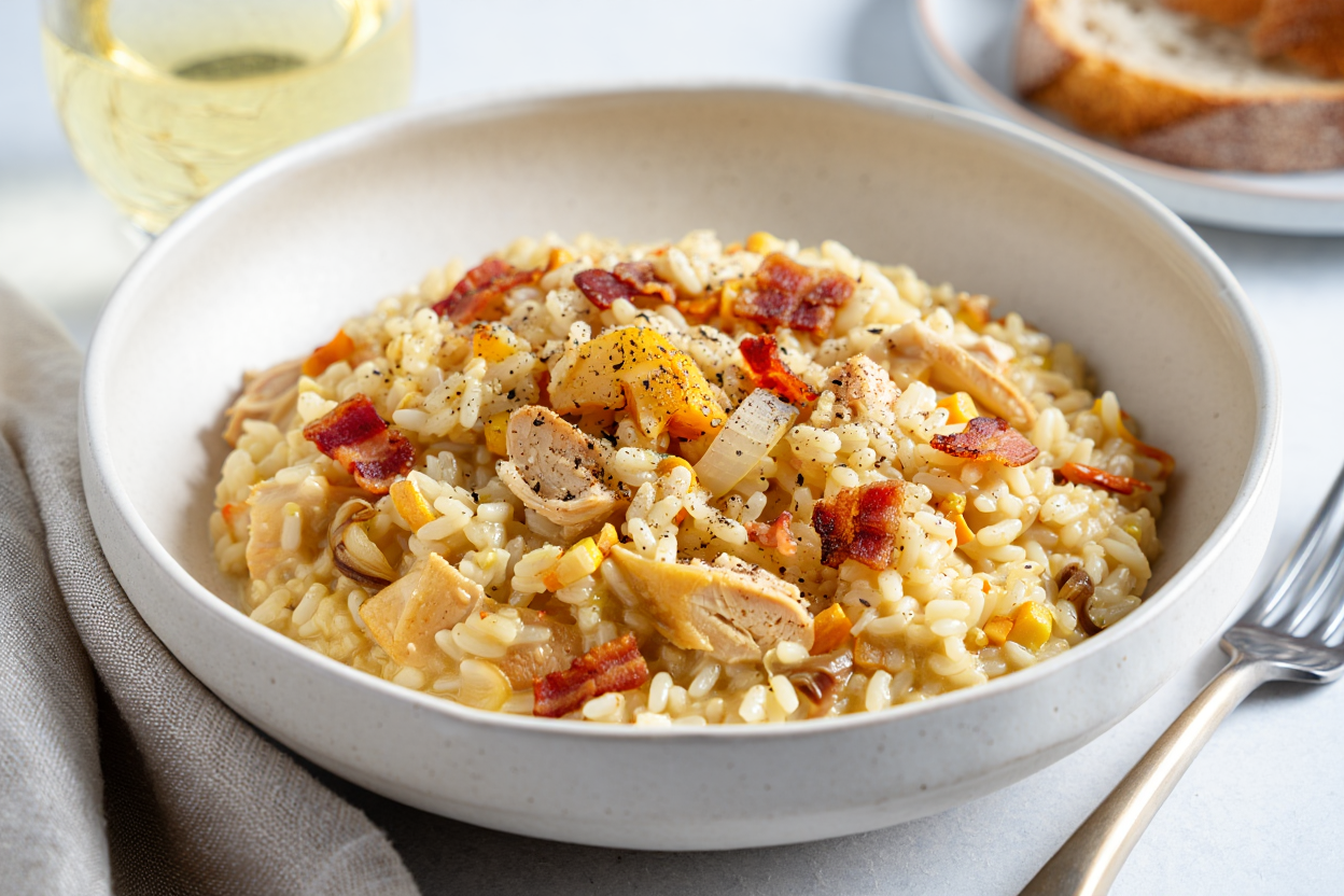Bacon, Cebolla, Pimienta, Arroz, Nata vegetal: Agua, grasas vegetales (palma), leche de mantequilla en polvo, almidón de maíz., Parmesano, Ragú de pollo