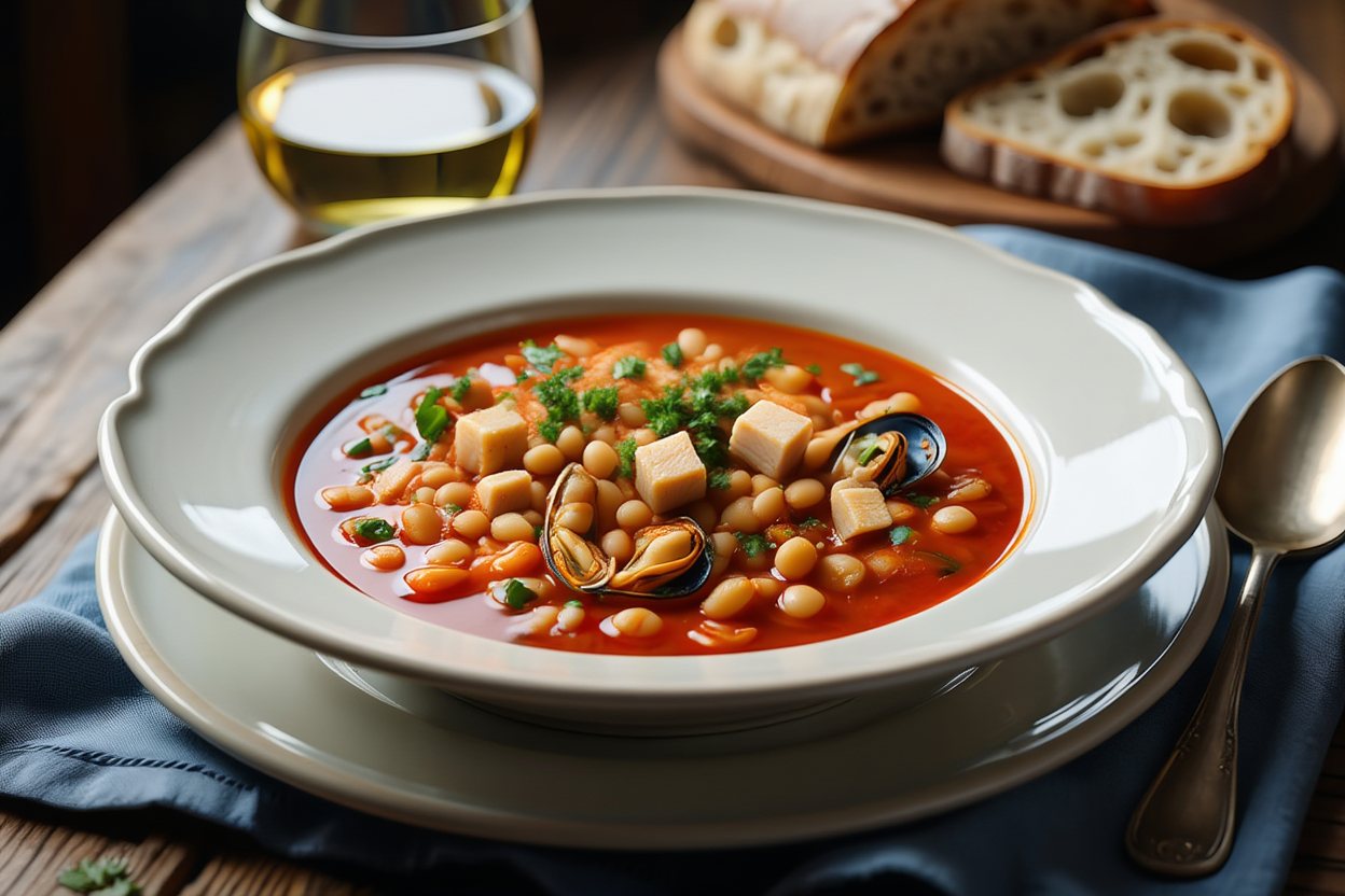 Aceite de oliva virgen extra, Ajo, Patatas, Pimiento rojo, Pimiento verde, Pimiento choricero, Vino blanco, Cebolla, Sal, Puerros, Mero (ultracongelado), Mantequilla, Alubias blancas, Mejillones ultracongelados, Sofrito de tomate y pimientos: tomate, cebolla, aceite de oliva virgen extra, pimiento rojo, pimiento verde., Caldo de pescado: Hortalizas (cebolla, ajo, tomate, puerro, zanahoria) Moluscos, crustáceos y pescado.