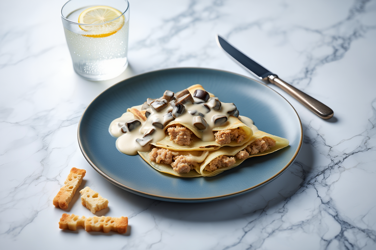 Sobrecitos de crepe rellenos de pollo con salsa cremosa de champiñones