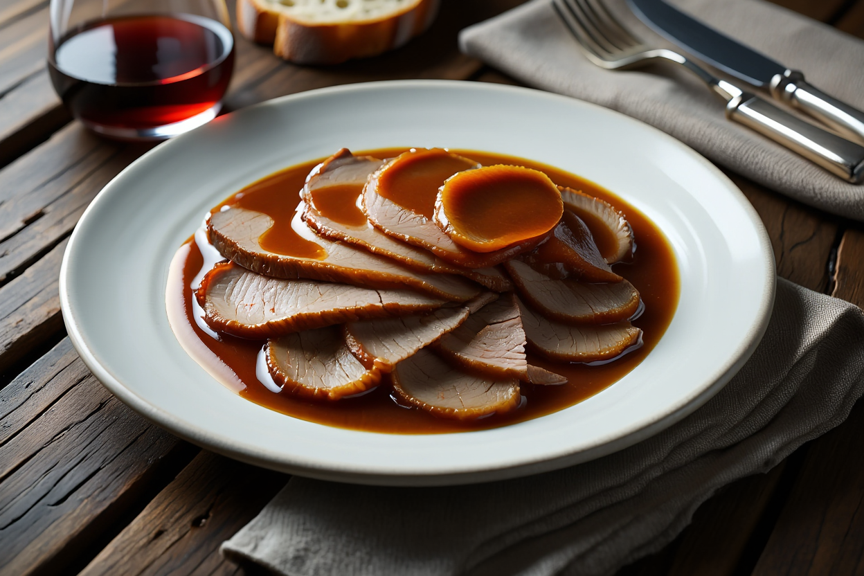 La ternera asada con su salsa es tan elegante que, si la sirves en la oficina, los bolígrafos empiezan a hablar en francés. 😂🥩🍷