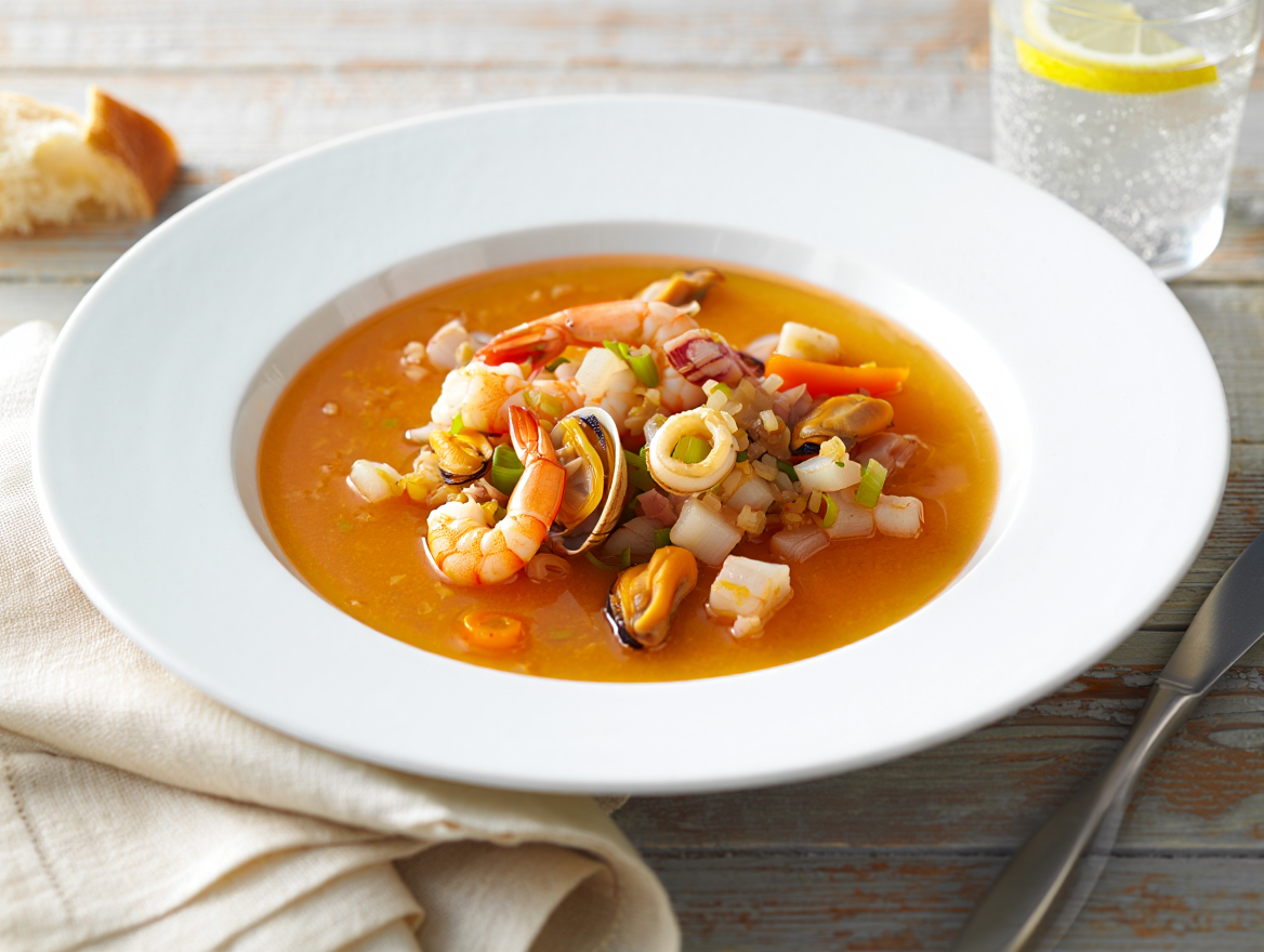 Aceite de oliva virgen extra, Ajo, Almejas, Calamar, Cazón, Cebolla, Gambas, Mejillones, Fumet de gambas, Pimiento verde, Tomate natural, Pimiento rojo, Colorante, Puerros, Langostinos