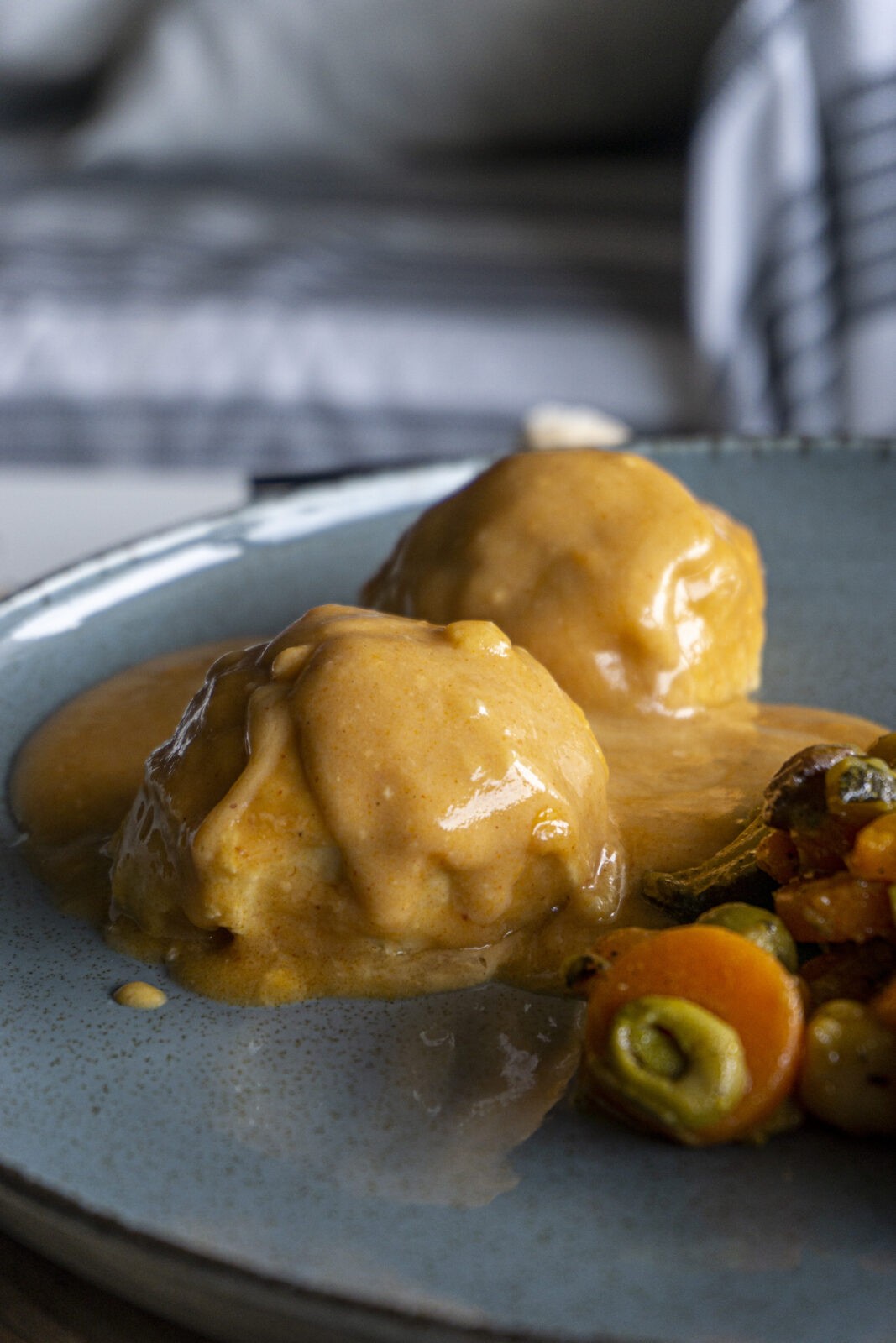 Dos albóndigas de pollo gigantes 🍗😅 bañadas en salsa cremosa de tomate y nata que abrazan cada bocado. Perfectas para la oficina: sabor casero, energía asegurada… y ningún jefe mirando tu plato.