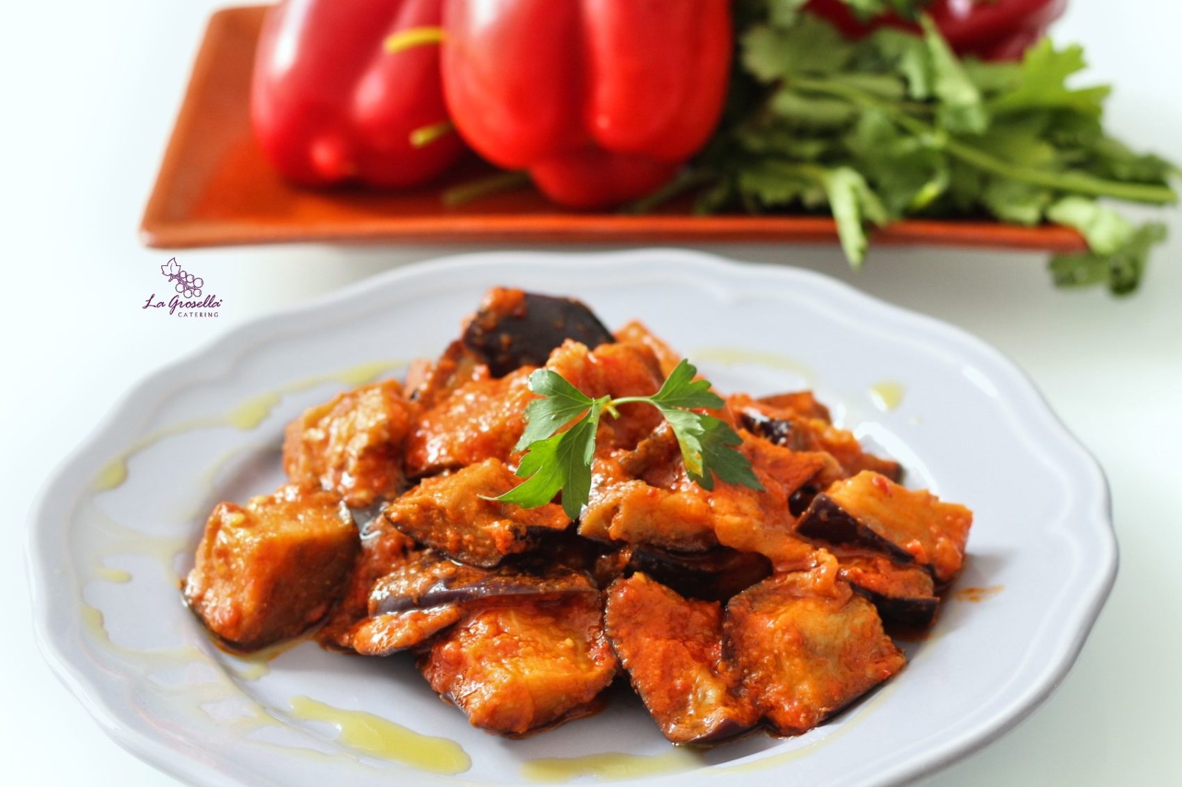 Berenjena hecha en el horno con poco aceite, acompañada de una deliciosa salsa casera con un ligero TOQUE PICANTE que le da el mojo rojo. Berenjenas (80%). Mojo (20%).