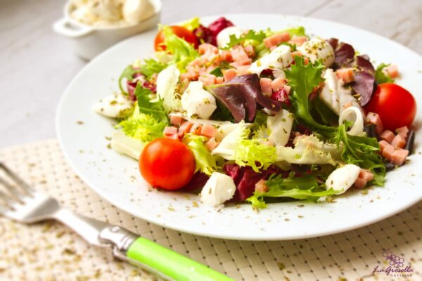 Esta ensalada verde con jamón york y mozzarella es como el compañero que nunca falla: siempre fresco, siempre apañado, y con ese toque de orégano que alegra más que un viernes con nómina. 😅🥗💼