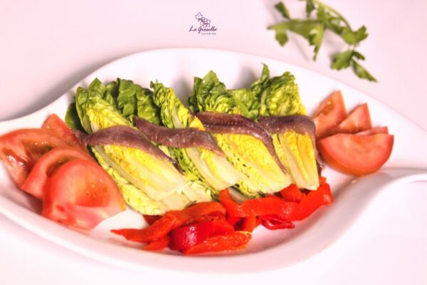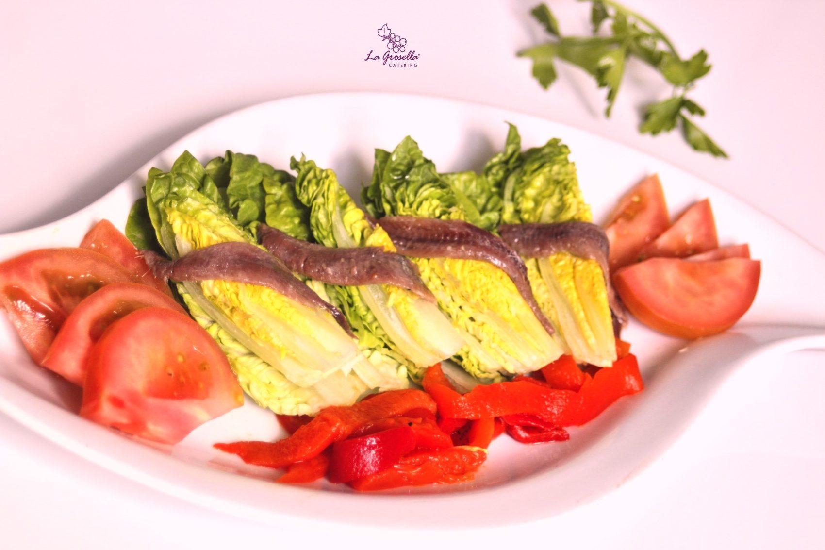 Riquisimos y frescos cogollos de lechuga acompañados de anchoa,pimientos del piquillo y tomate.
