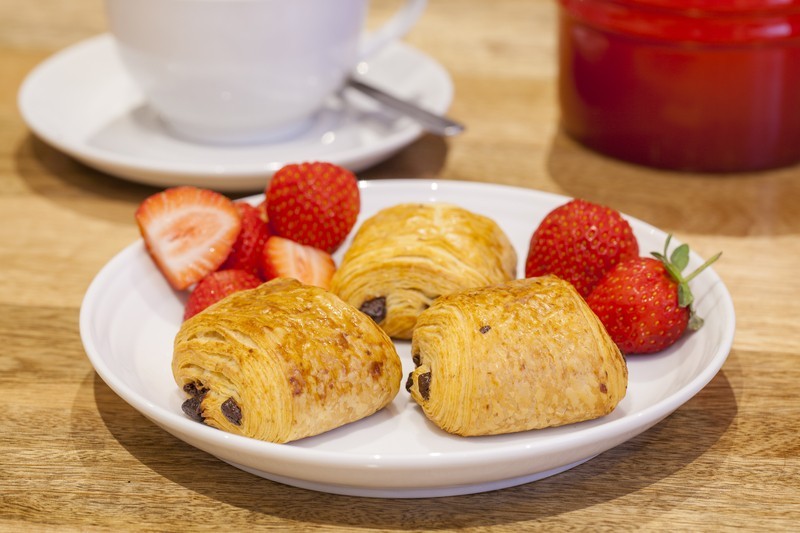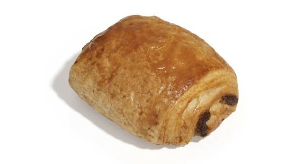 Minipastelito de mantequilla con dos barras de chocolate negro, pintado con huevo.