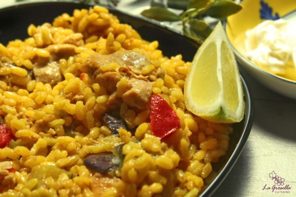 Deliciosa paella casera con arroz, gambas, mejillones, almejas, cazón, anillas de calamar y pollo todo pelado, por supuesto, y con sofrito de pimiento rojo, pimiento verde, cebolla, tomate natural, ajo, tomate natural y aceite de oliva virgen extra.