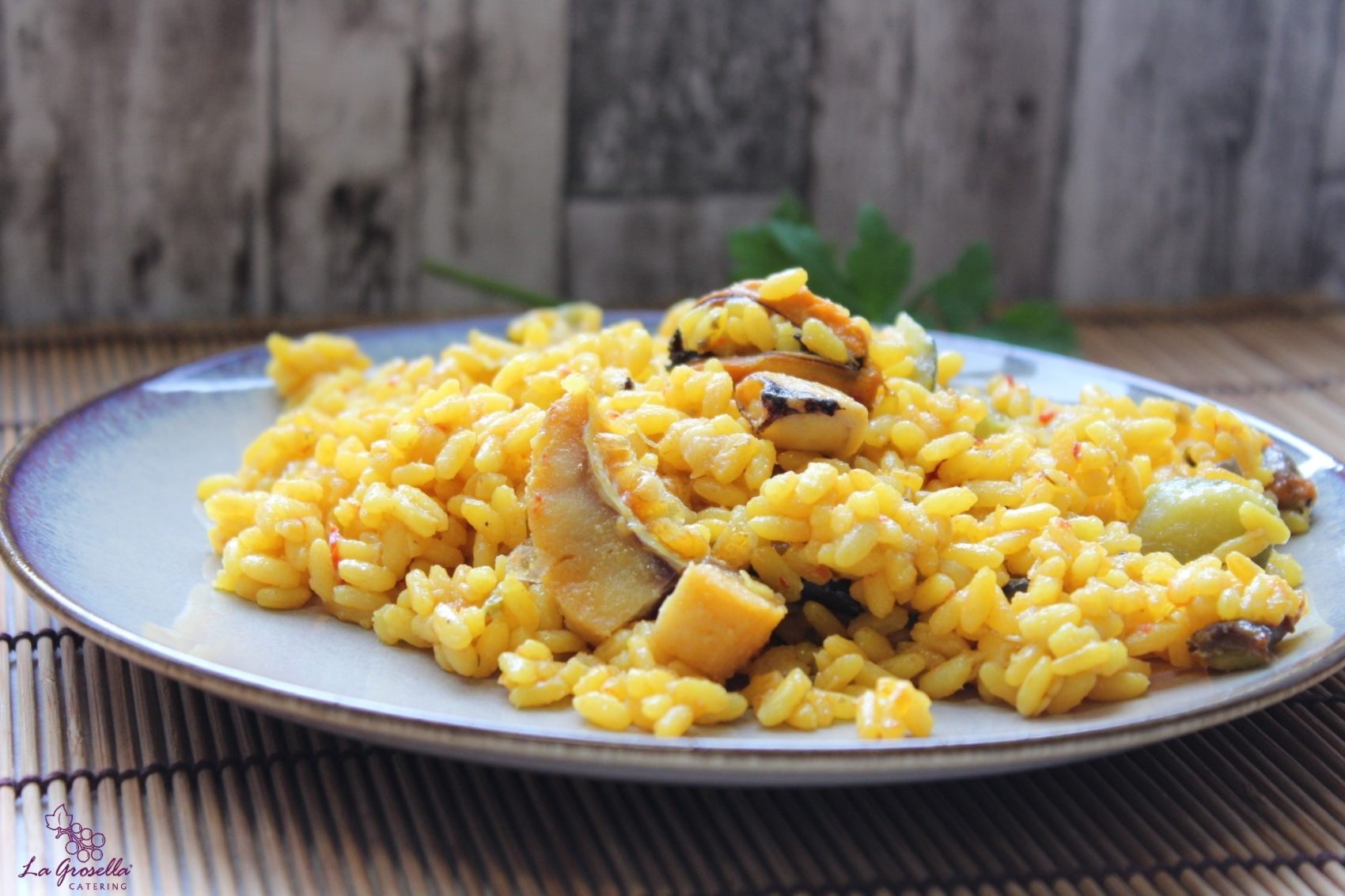 Deliciosa paella casera con arroz, cazón, calamares ,almejas, mejillones, gambón, gamba arrocera, langostinos y sofrito de pimiento rojo, pimiento verde, cebolla, ajo,  tomate natural y aceite de oliva virgen extra.