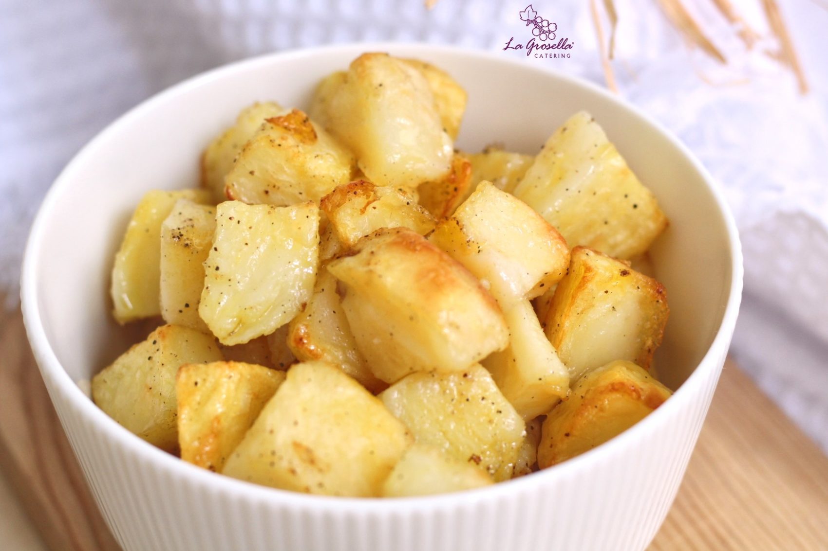 Esta vez os traemos unas patatas cortadas en dados hechas en el horno, están aliñadas con aceite de oliva virgen extra y un toque de pimienta.