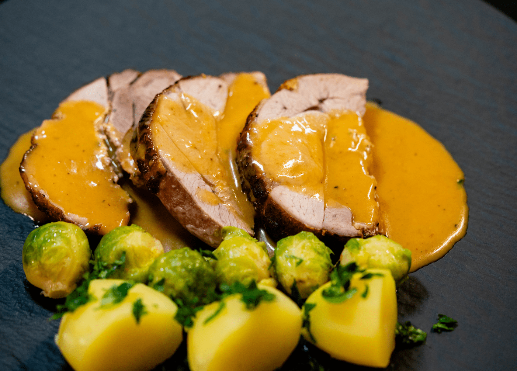 La salsa gravy, típica para el día de Acción de Gracias, con su textura cremosa y sabor intenso, realza el sabor del solomillo, aportando una deliciosa complejidad.