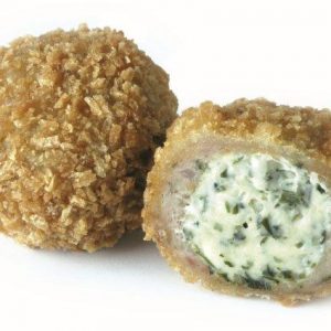 Delicioso snack en forma de croqueta, ingrediente principal de pollo y relleno de queso fresco, perejil y cebollino. 12 gr.
