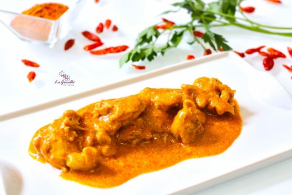 Nuestra receta al estilo Tandoori Masala. Ligeramente picante, suavizamos mucho ésta receta con salsa de yogur para que tenga un toque especial que le dan las especias masala y lo puedas disfrutar en tu oficina.