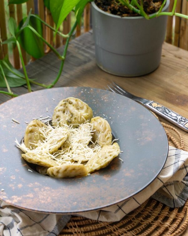 Nuevo plato sano y sabroso. Raviolis caseros y hechos a mano con pasta fresca, rellenos de patatas (60%), setas (10%) y nuestra salsa especial de pesto.