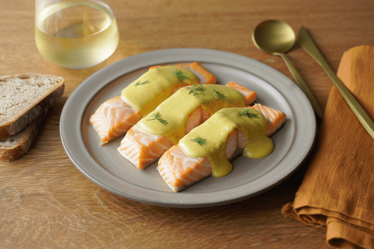 Delicados lomos de salmón horneados sin piel, cubiertos con una cremosa salsa de mostaza y un toque fresco de eneldo. Un plato lleno de sabor, ideal para quienes buscan una opción saludable y sabrosa.