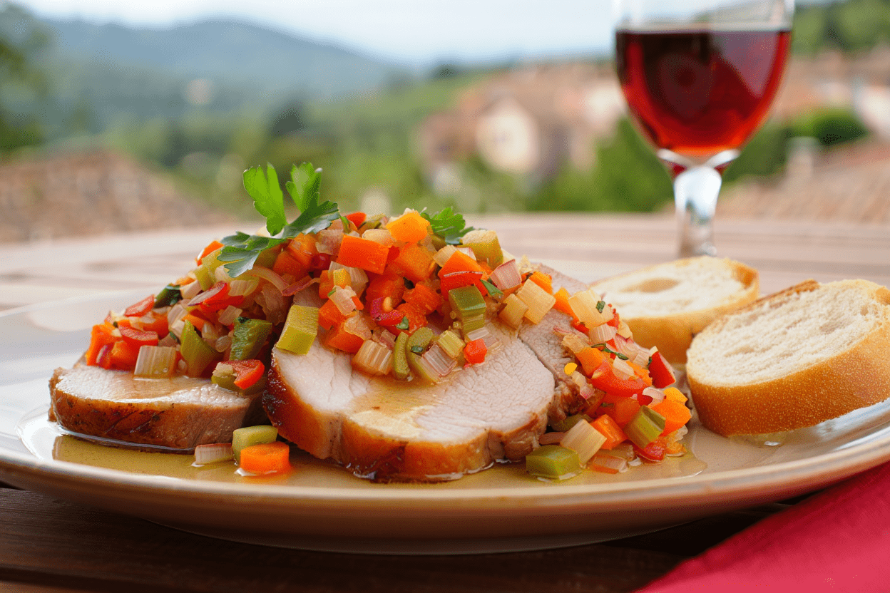 Jugosa paleta de cerdo asada lentamente y troceada, servida con una sabrosa salsa jardinera elaborada con verduras frescas como zanahoria, pimientos, cebolla, tomate, puerro y apio, todo suavemente cocinado con vino blanco, ajo, perejil, cilantro y aceite de oliva virgen extra. Un plato tradicional, reconfortante y lleno de sabor casero.