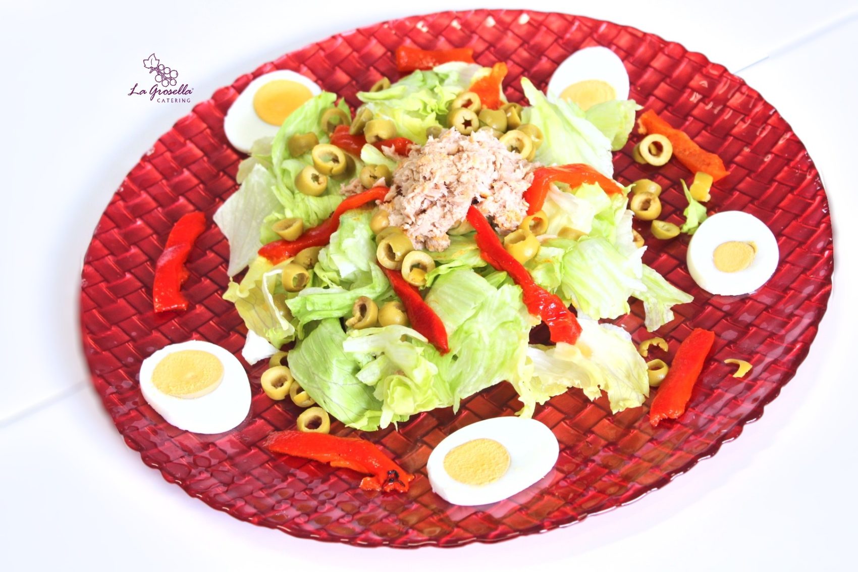Atún, Huevo duro, Lechuga iceberg, Pimiento asado, Cebolla, Aceitunas verdes