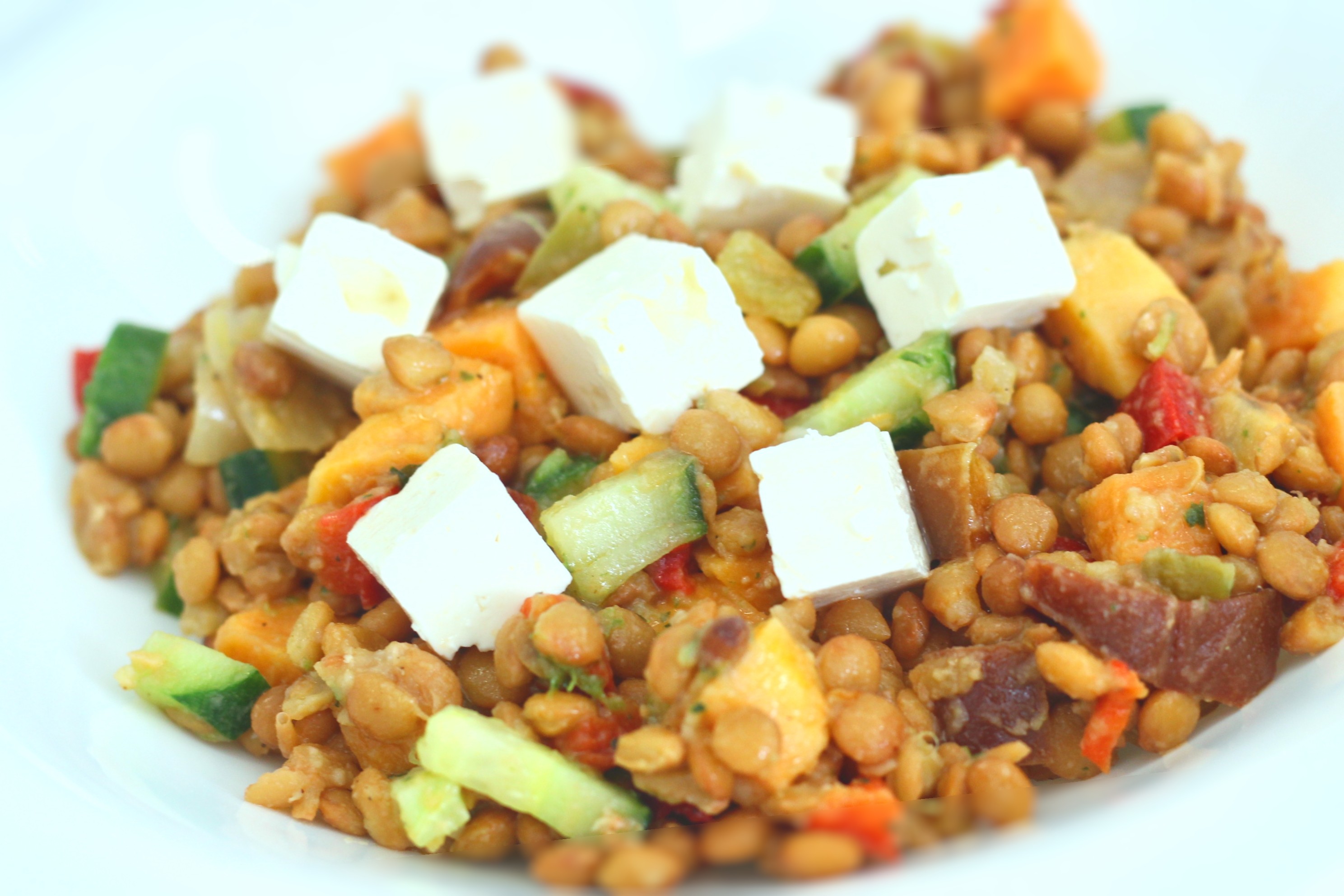 Esta ensalada de lentejas con verduras (30%) y queso feta (5%) nos ha salido riquísima! un plato saludable y una forma diferente de comer legumbres.